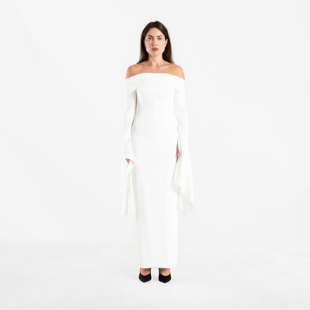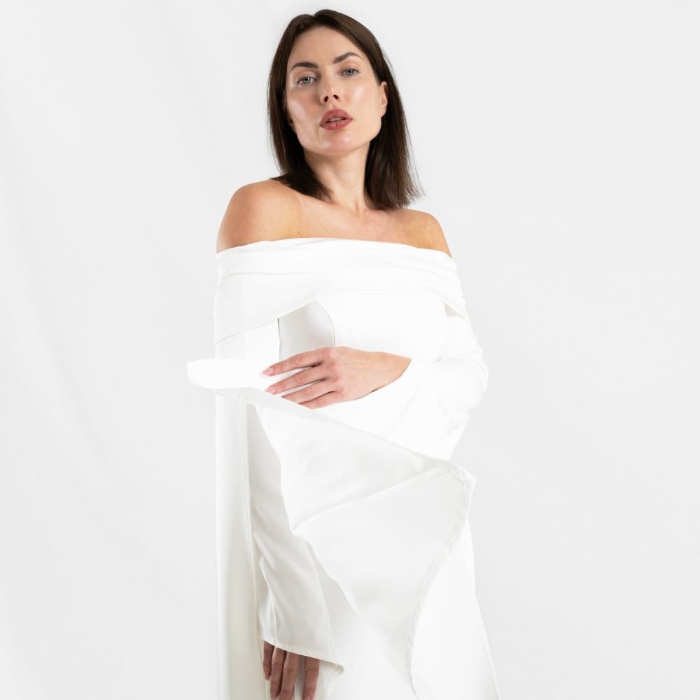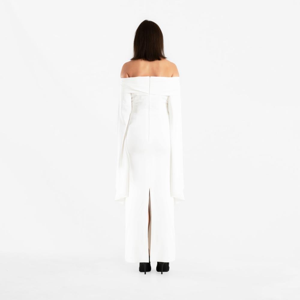 فستان سهرة ابيض ناعم بأكمام طويلة مفتوحة وأكتاف مكشوفة