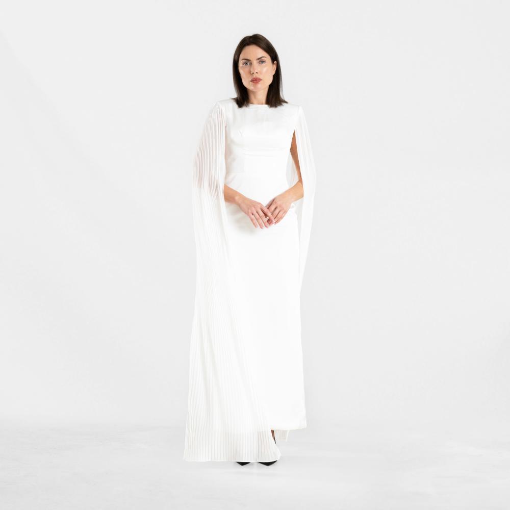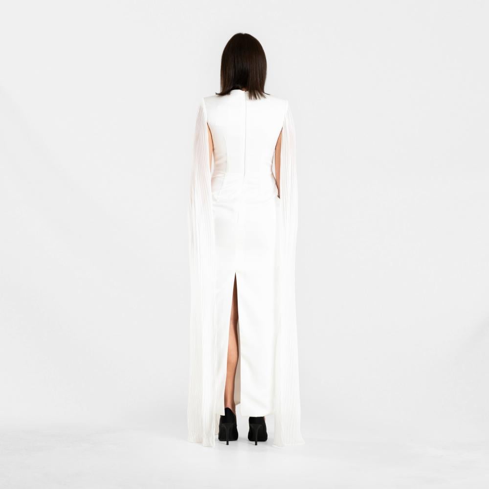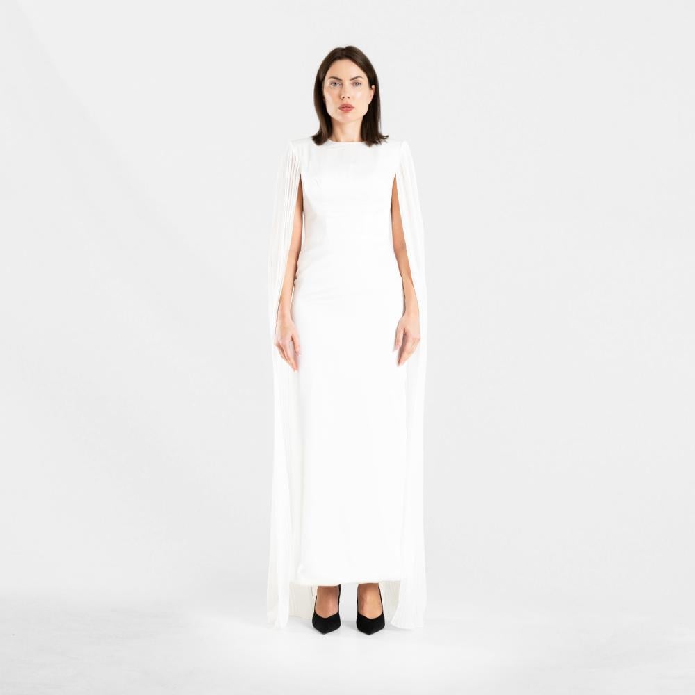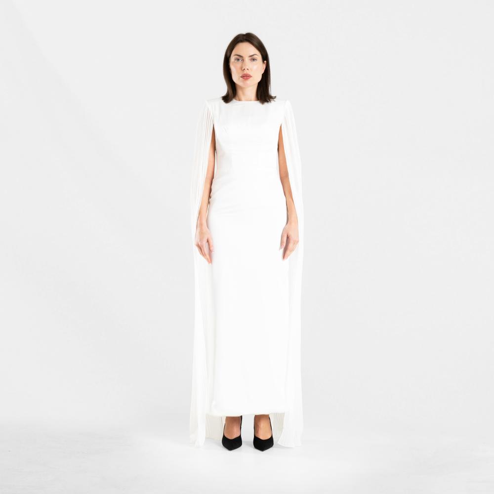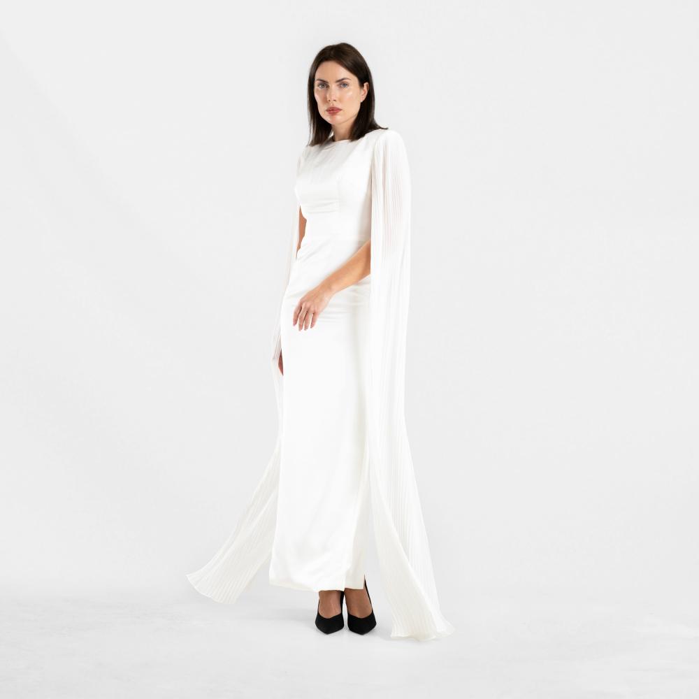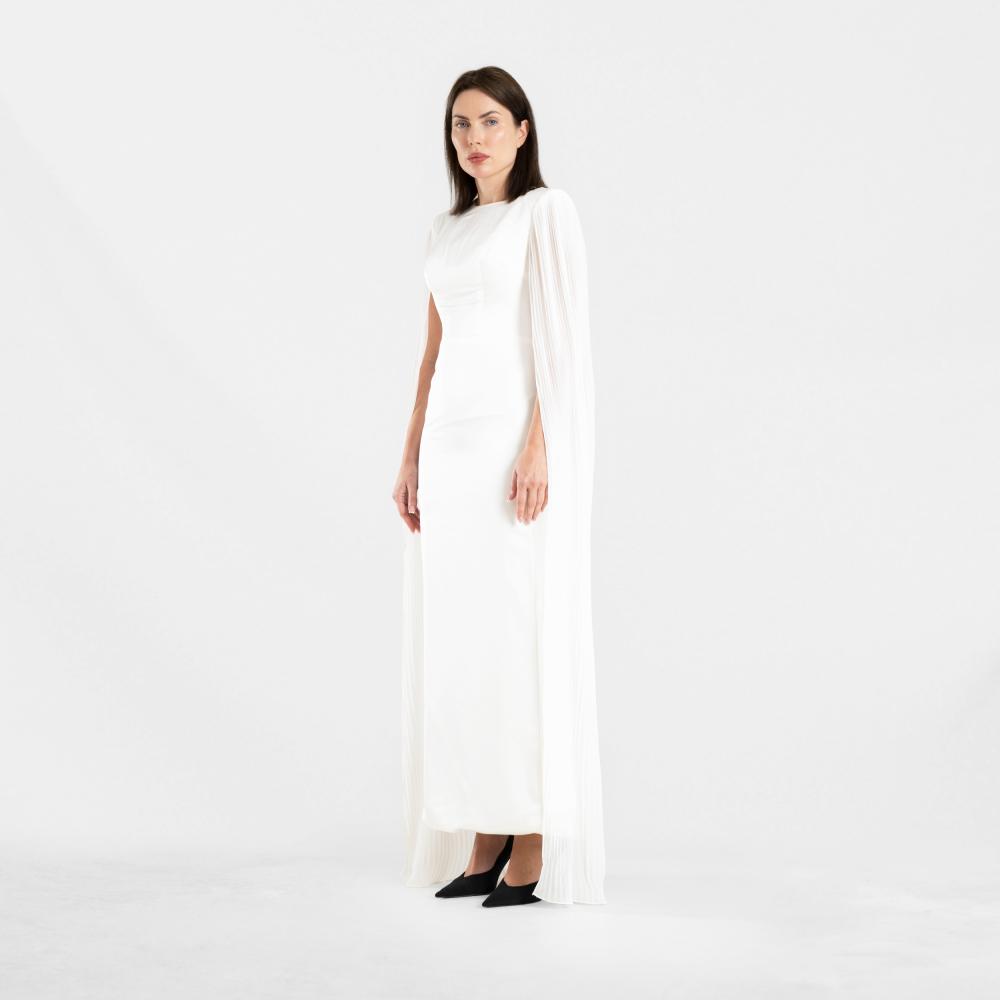 فستان سهرة ابيض ناعم مع كم بكسرات ملكي