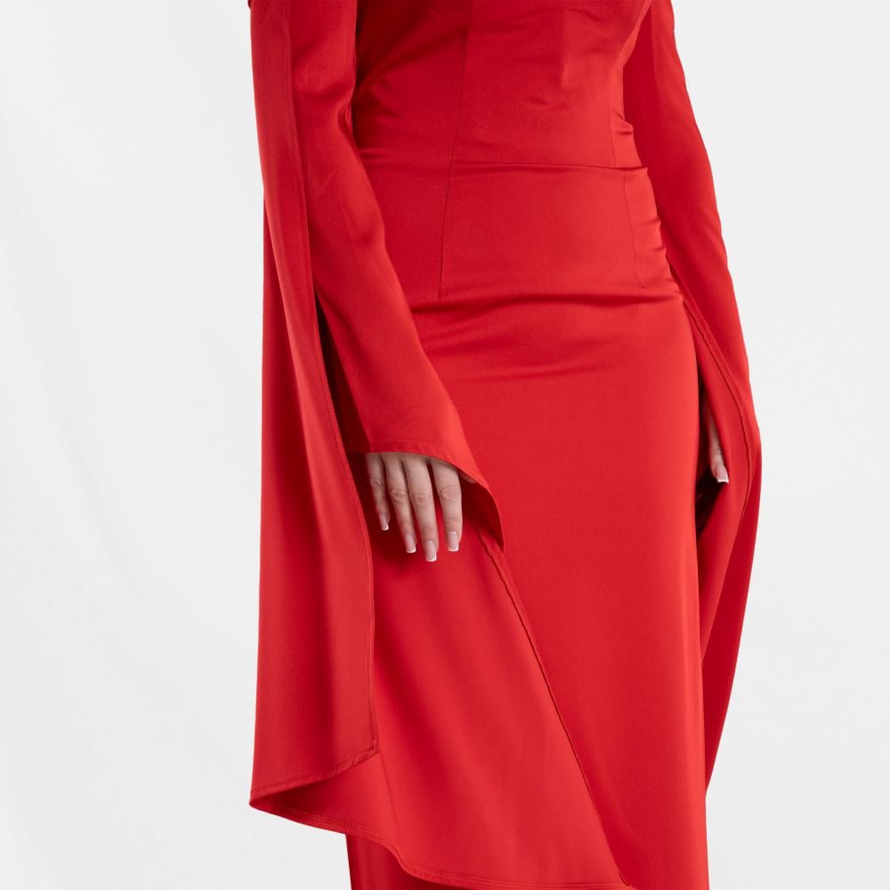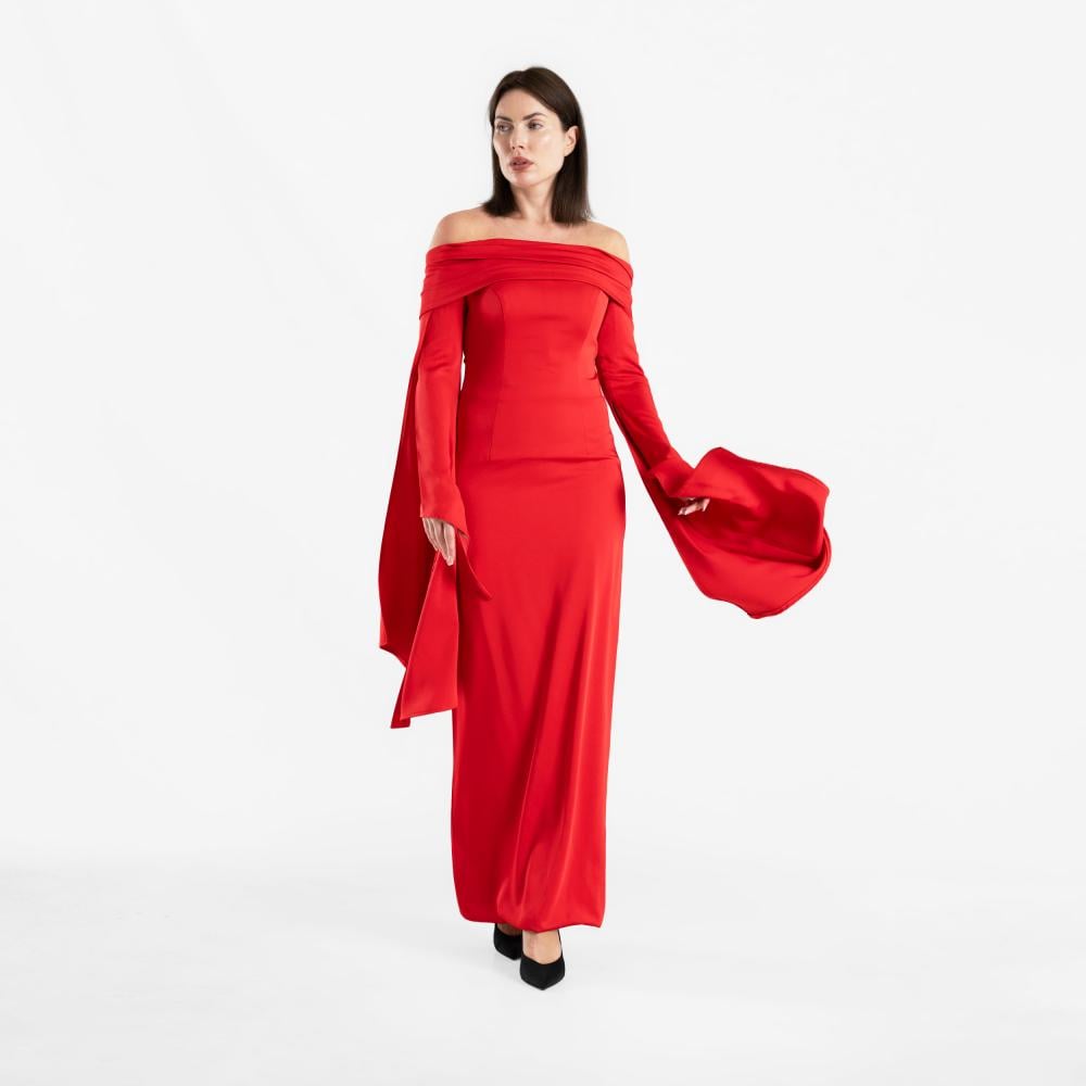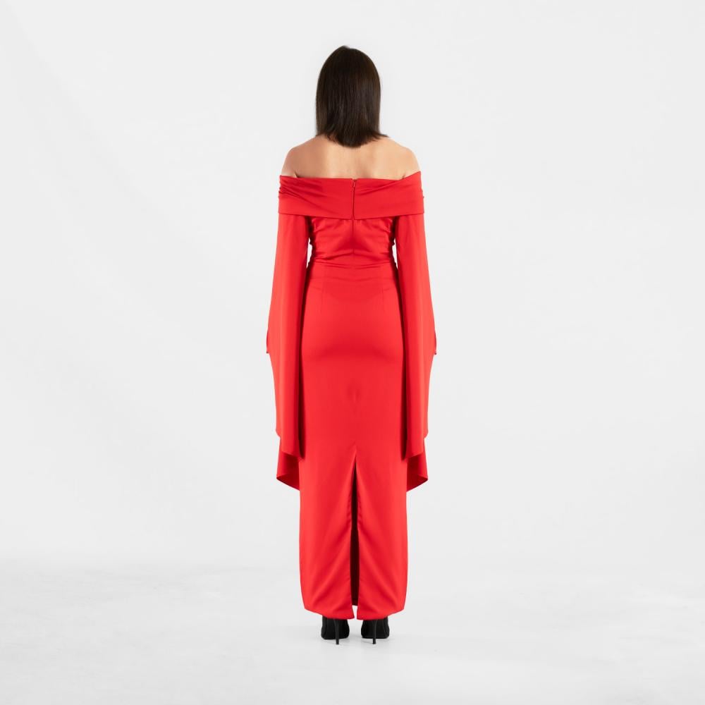 فستان سهرة احمر بأكمام طويلة مفتوحه وكتف مكشوفه