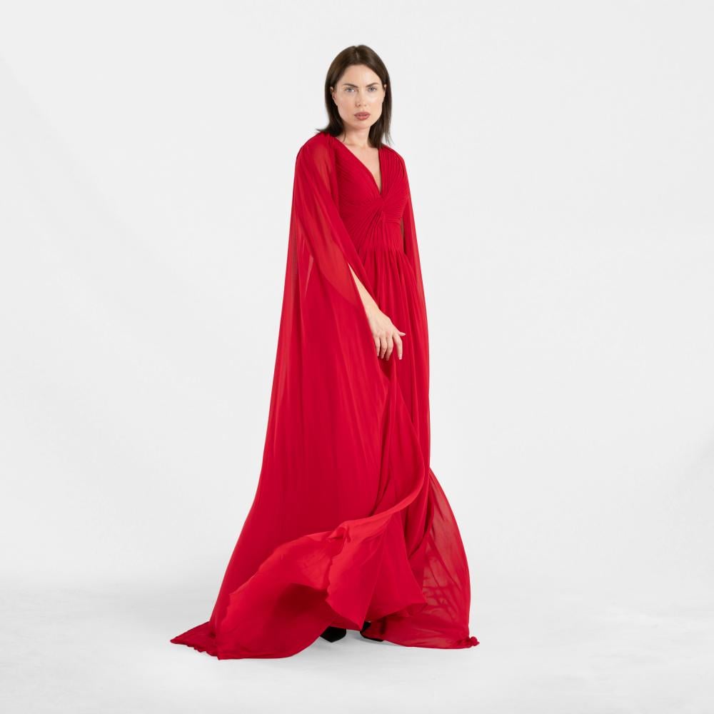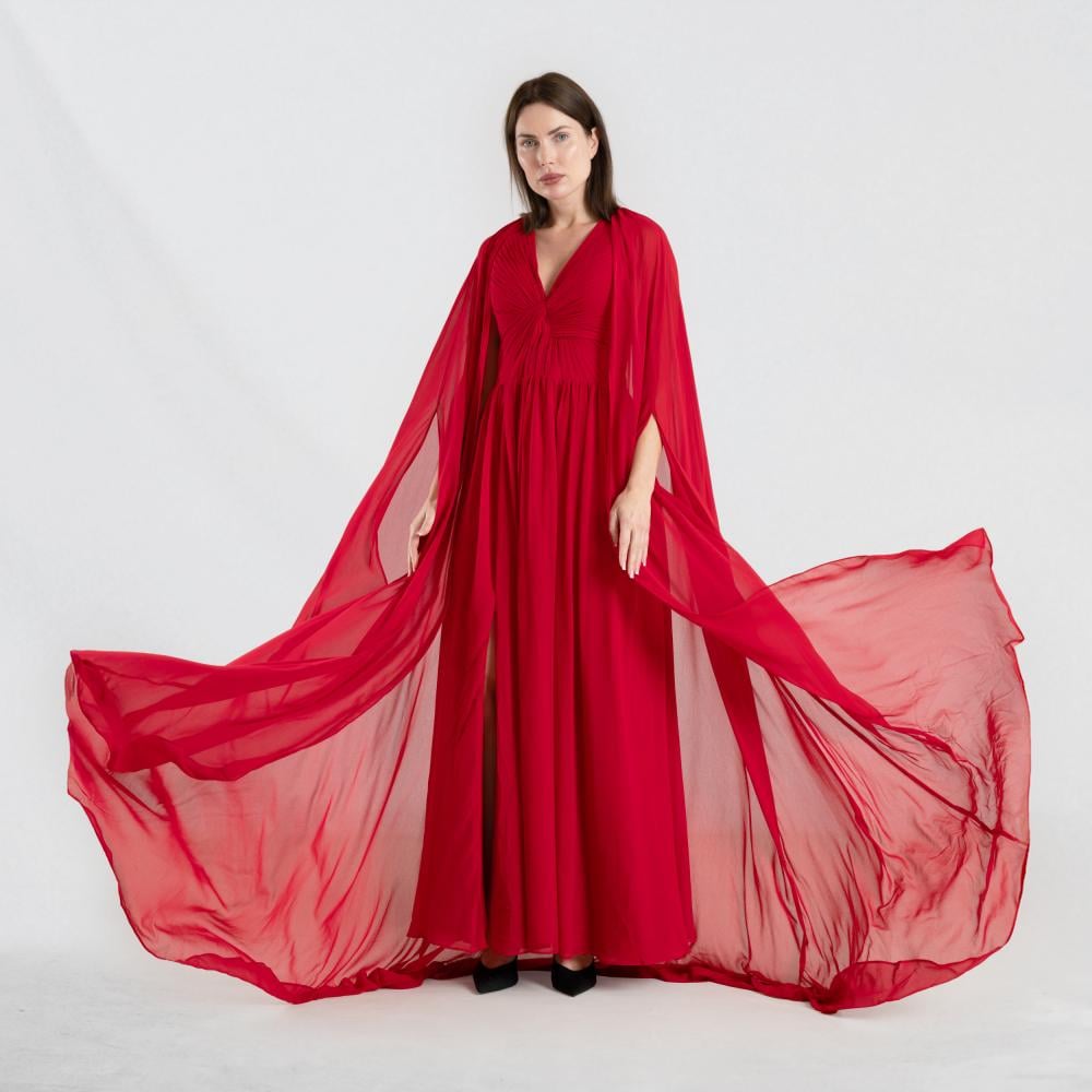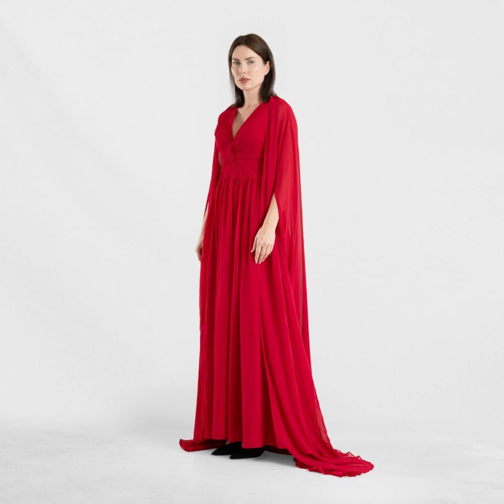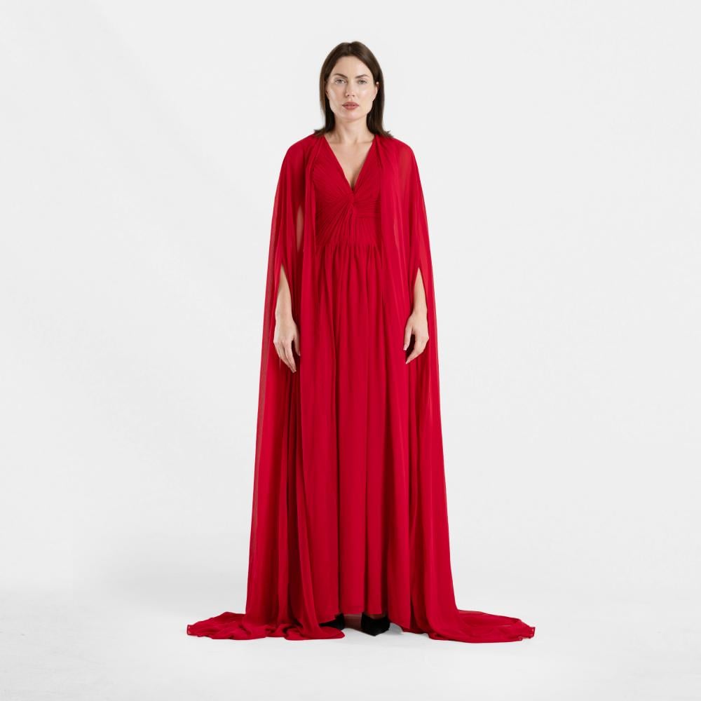 - التصميم: فستان سهرة احمر طويل بأكمام كيب أنيقة