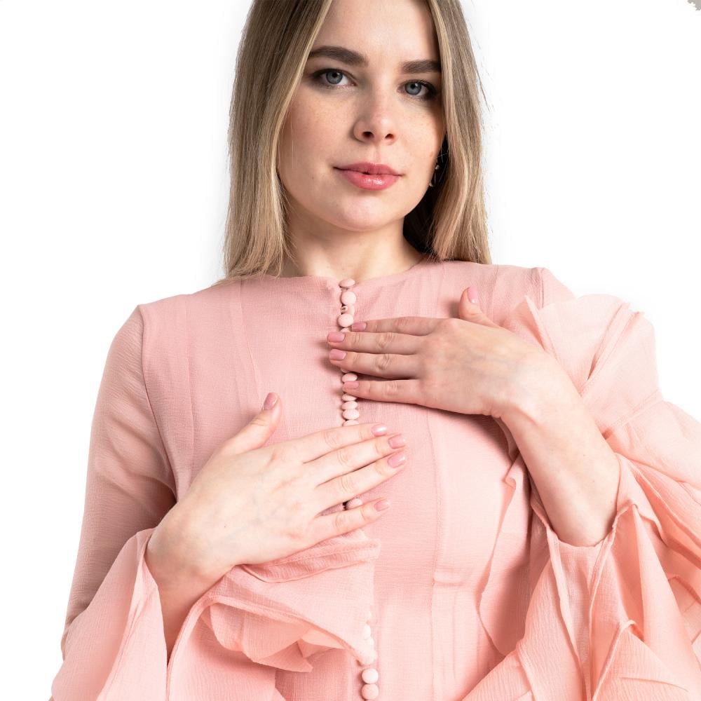 • التفاصيل: أزرار أمامية وكشكش أنيقة على الأكمام.
