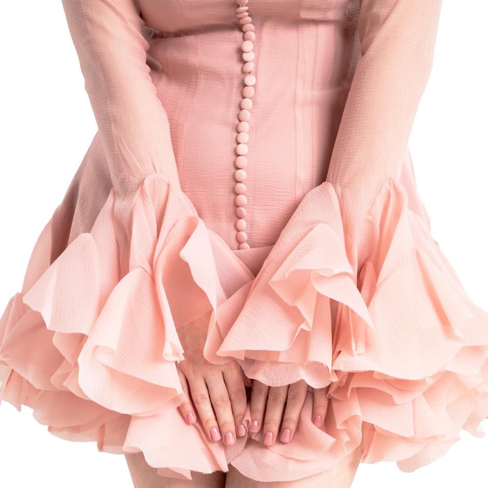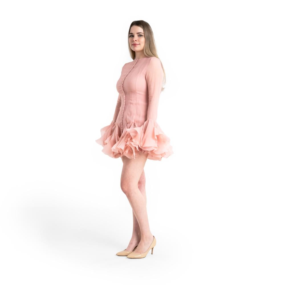 فستان وردي قصير سهرة بأكمام كشكش راقية